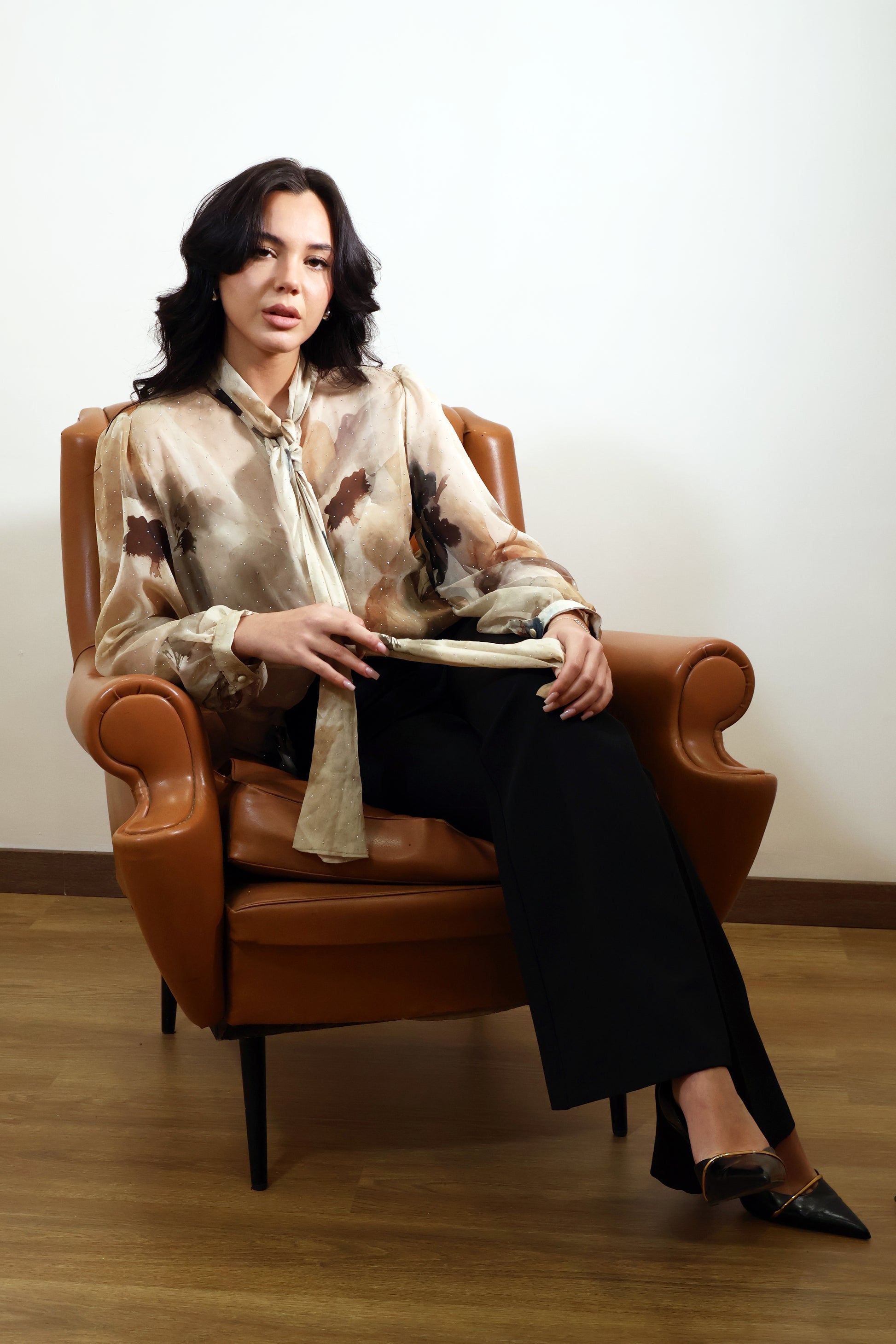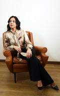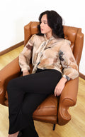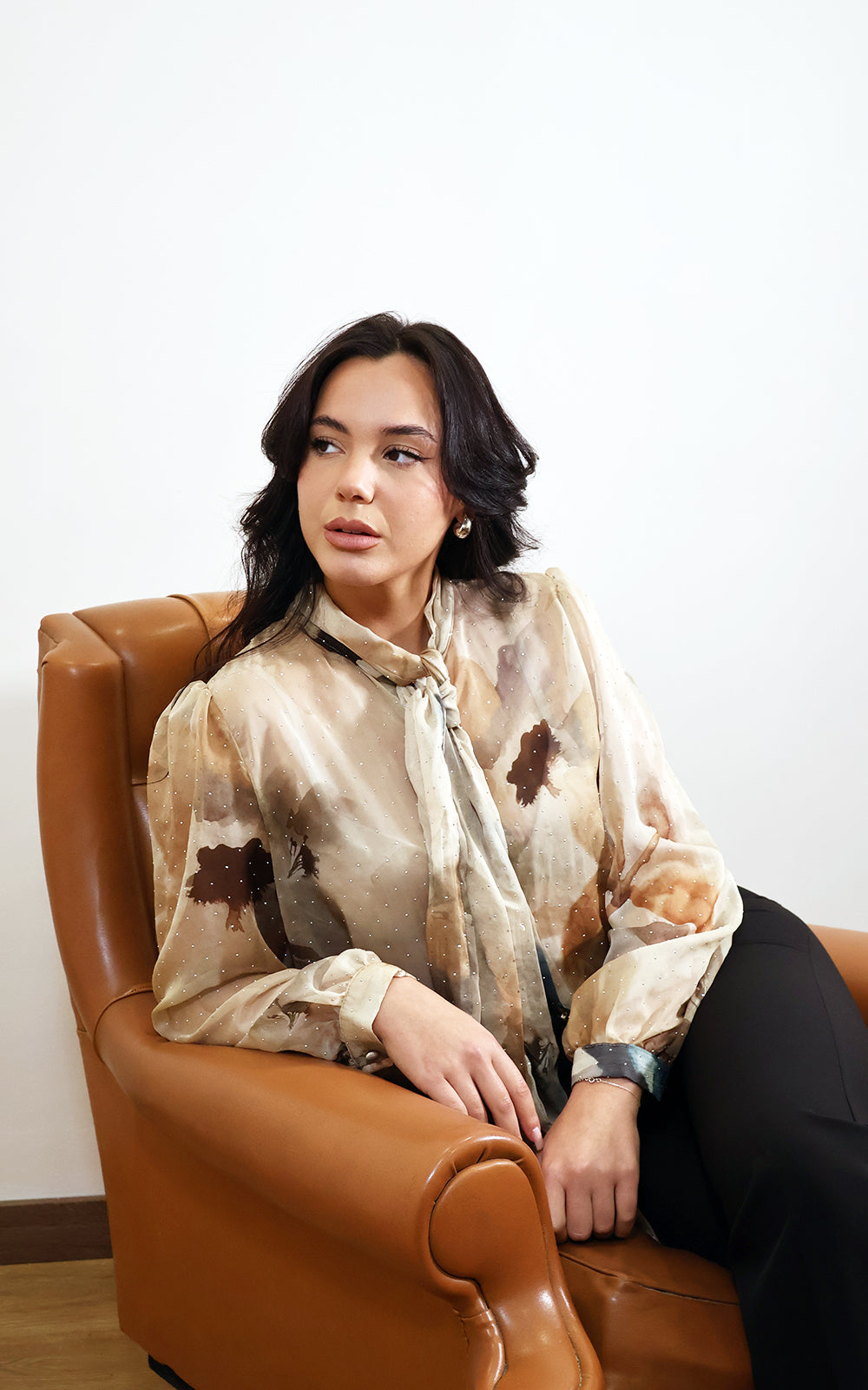 Camicia velata a fantasia ,impreziosita di piccoli brillantini che donano un tocco di eleganza in più .Chiusura con bottoncini ,al collo e’ rifinita con un foulard da annodare a fiocco o portare sciolto.