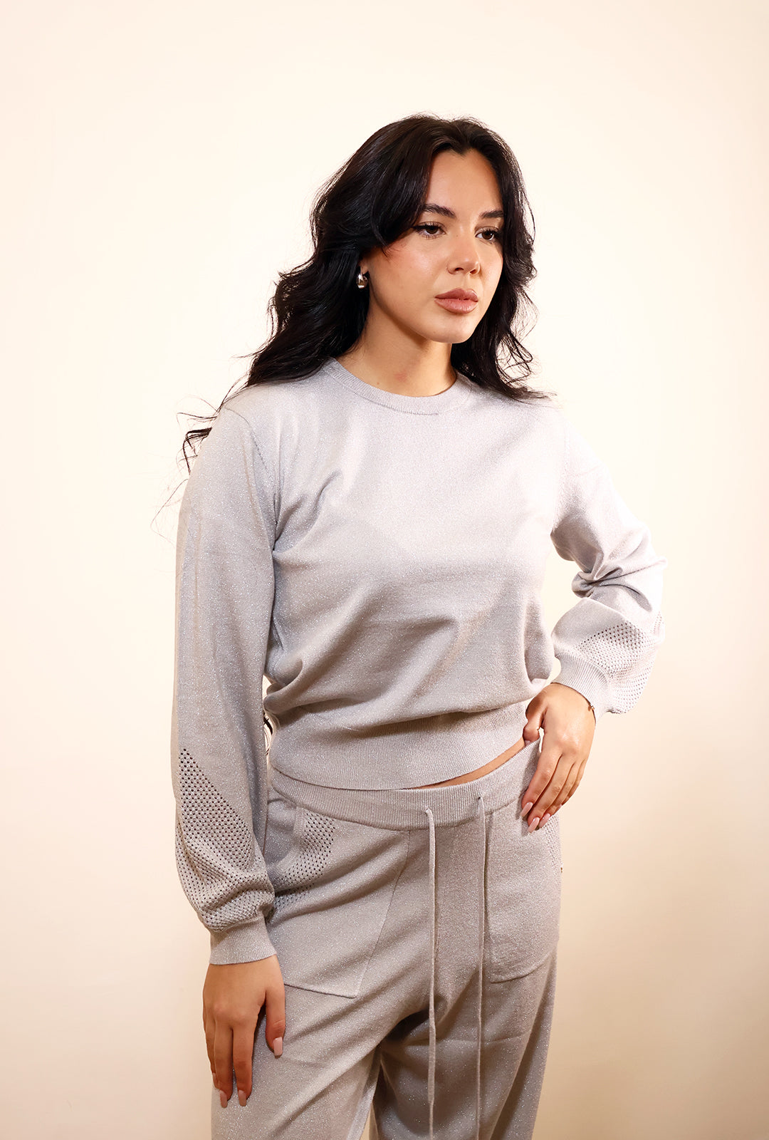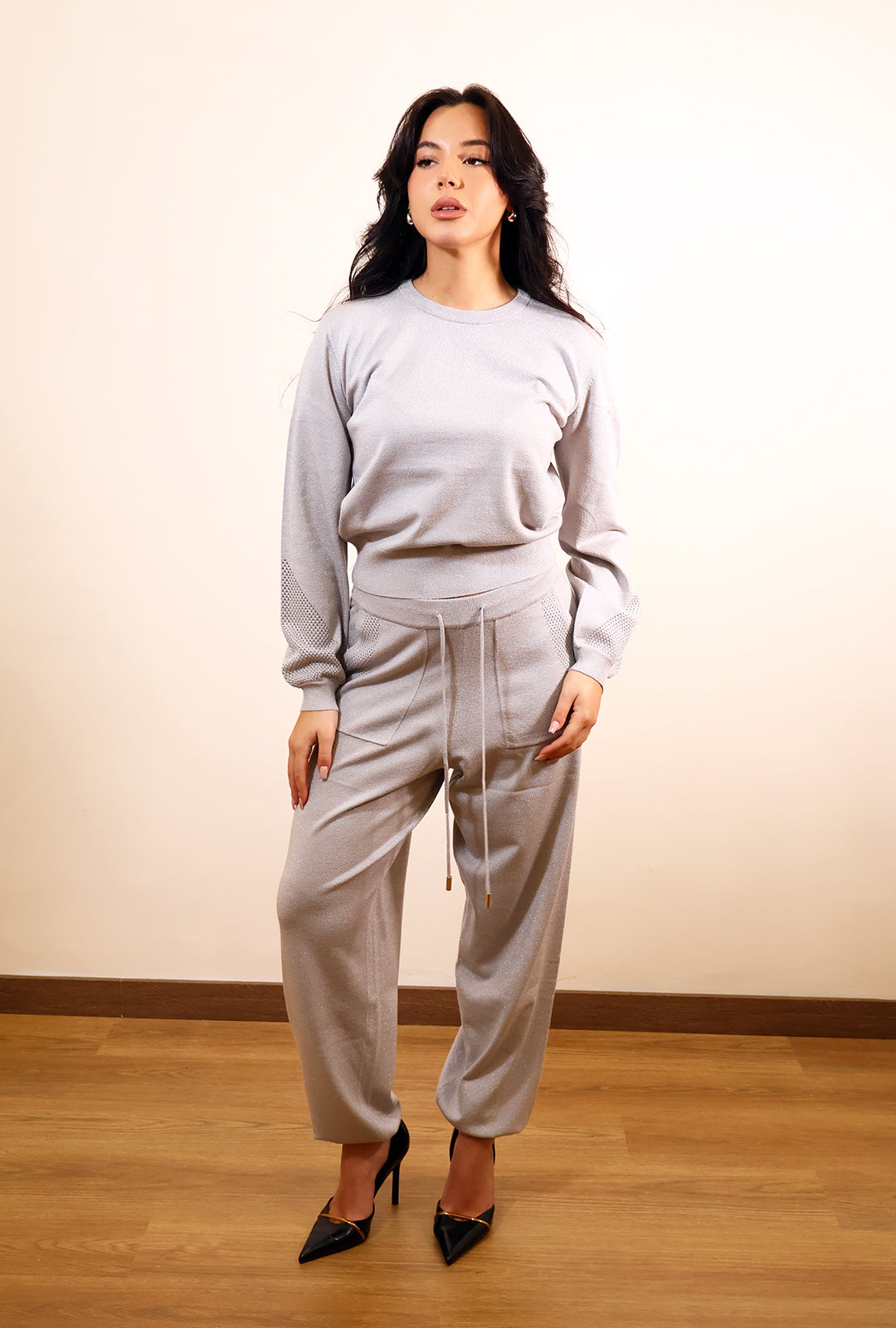 Cordinato pantalone più maglia di Gaudi.Pantalone con elastico al fondo,la maglia presenta dei motivi traforati che la rendono super chic.Bella con i tacchi ma comodissima con le tue Sneakers preferite.