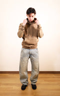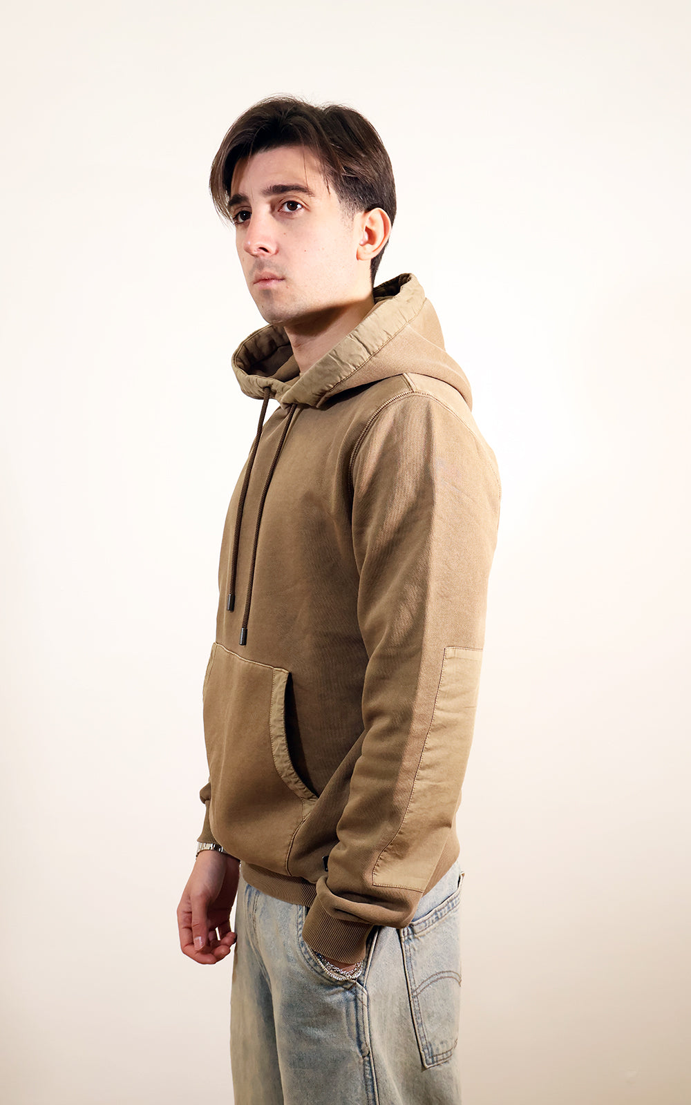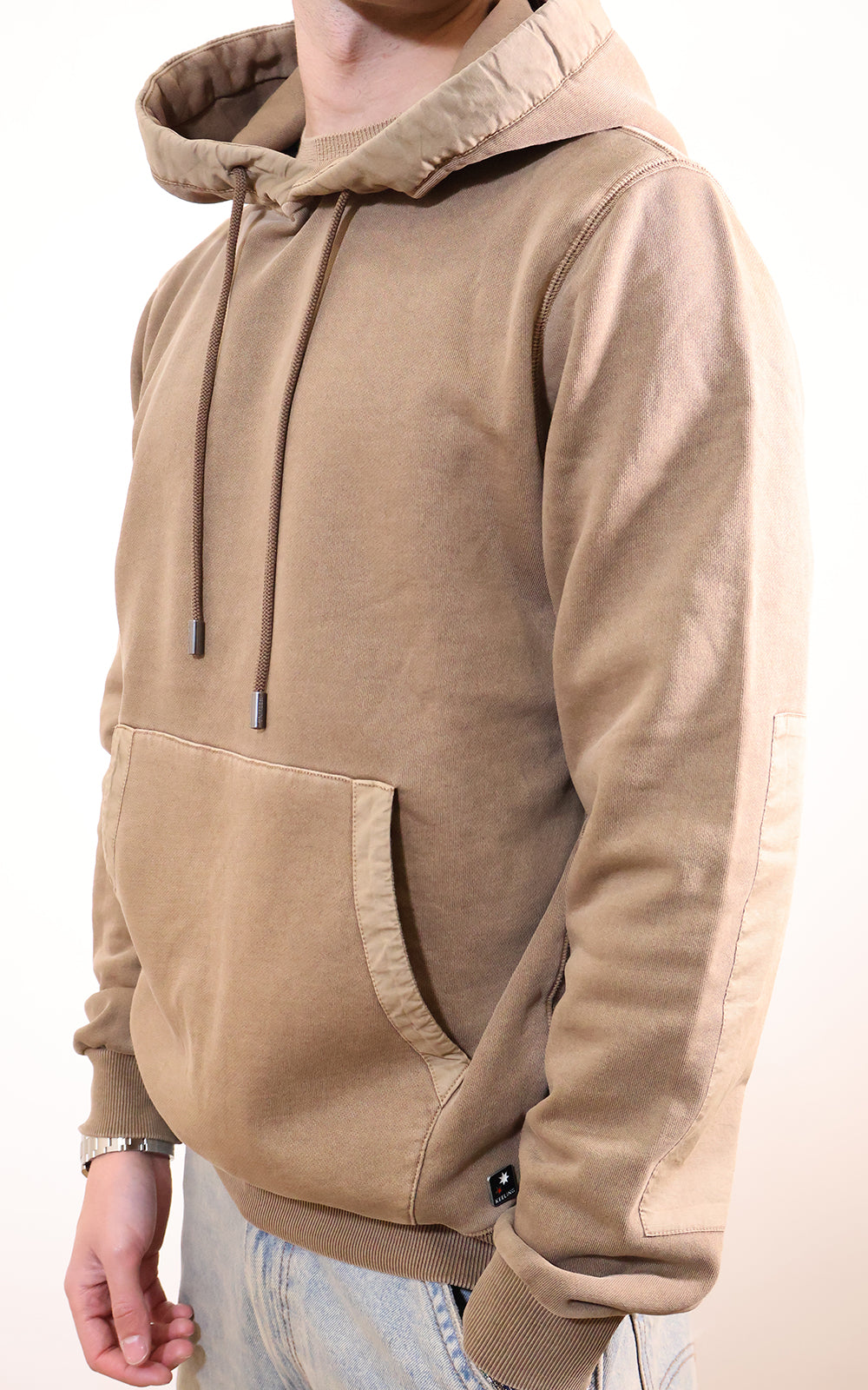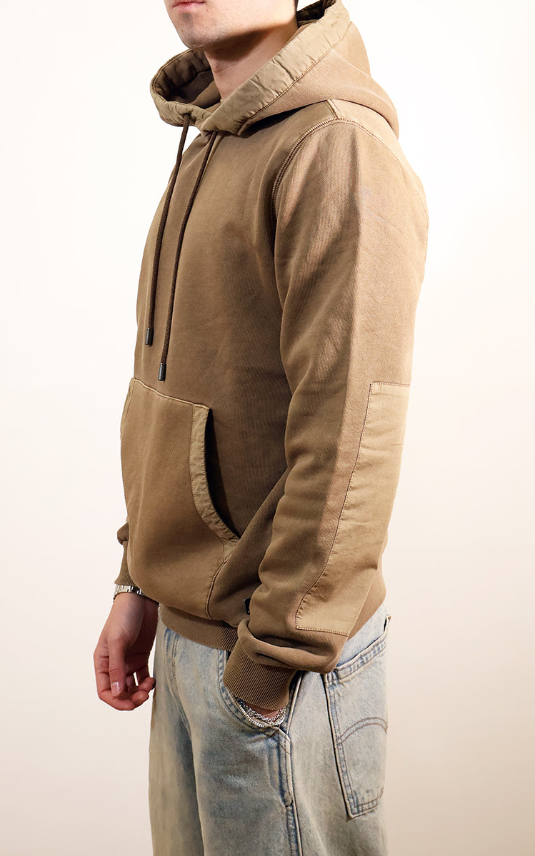 Felpa chiusa con cappuccio,toppe cucite sotto al gomito. Realizzata in 100% cotone ,tutti i capi KEELING sono tinti risparmiando il 95% di acqua.