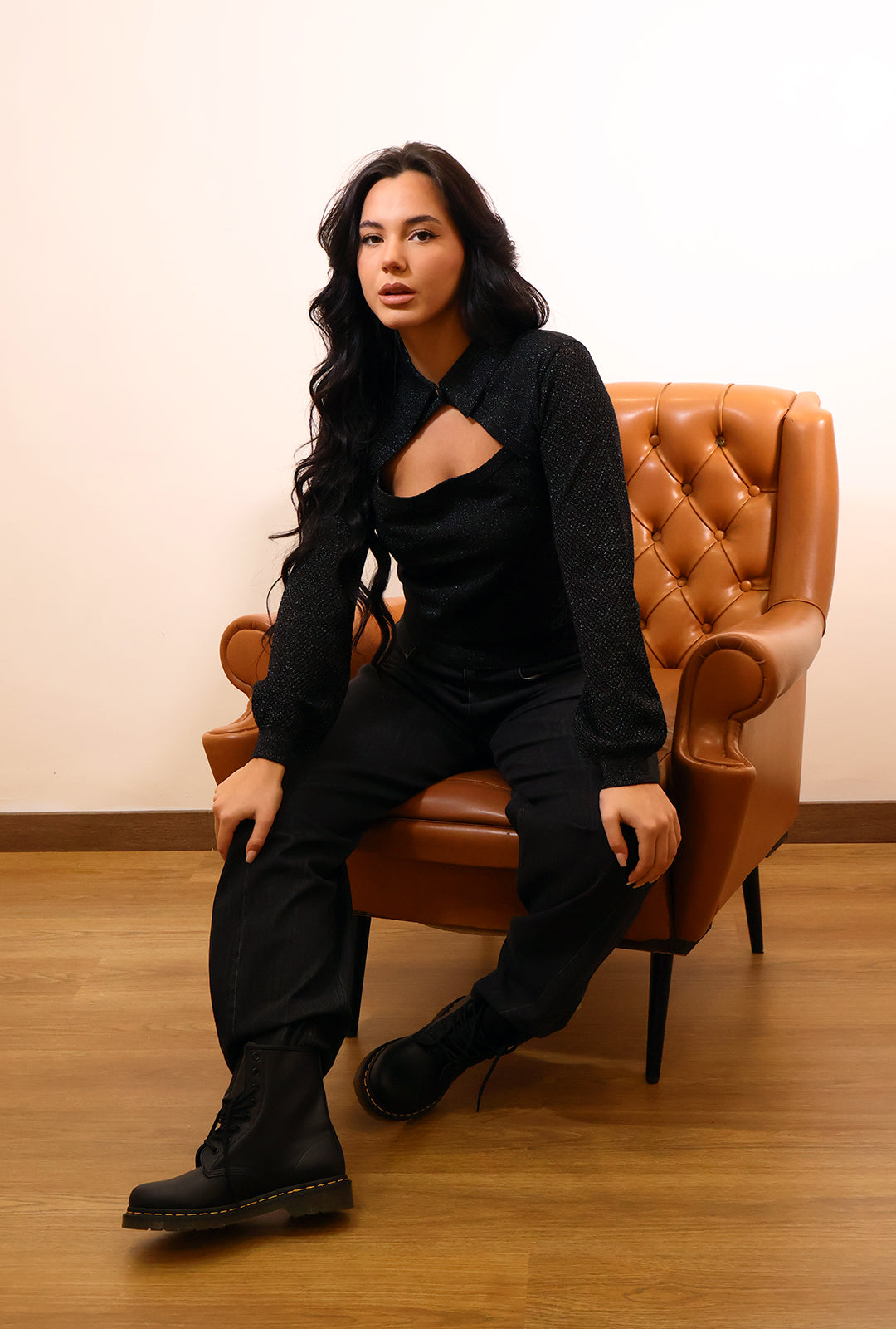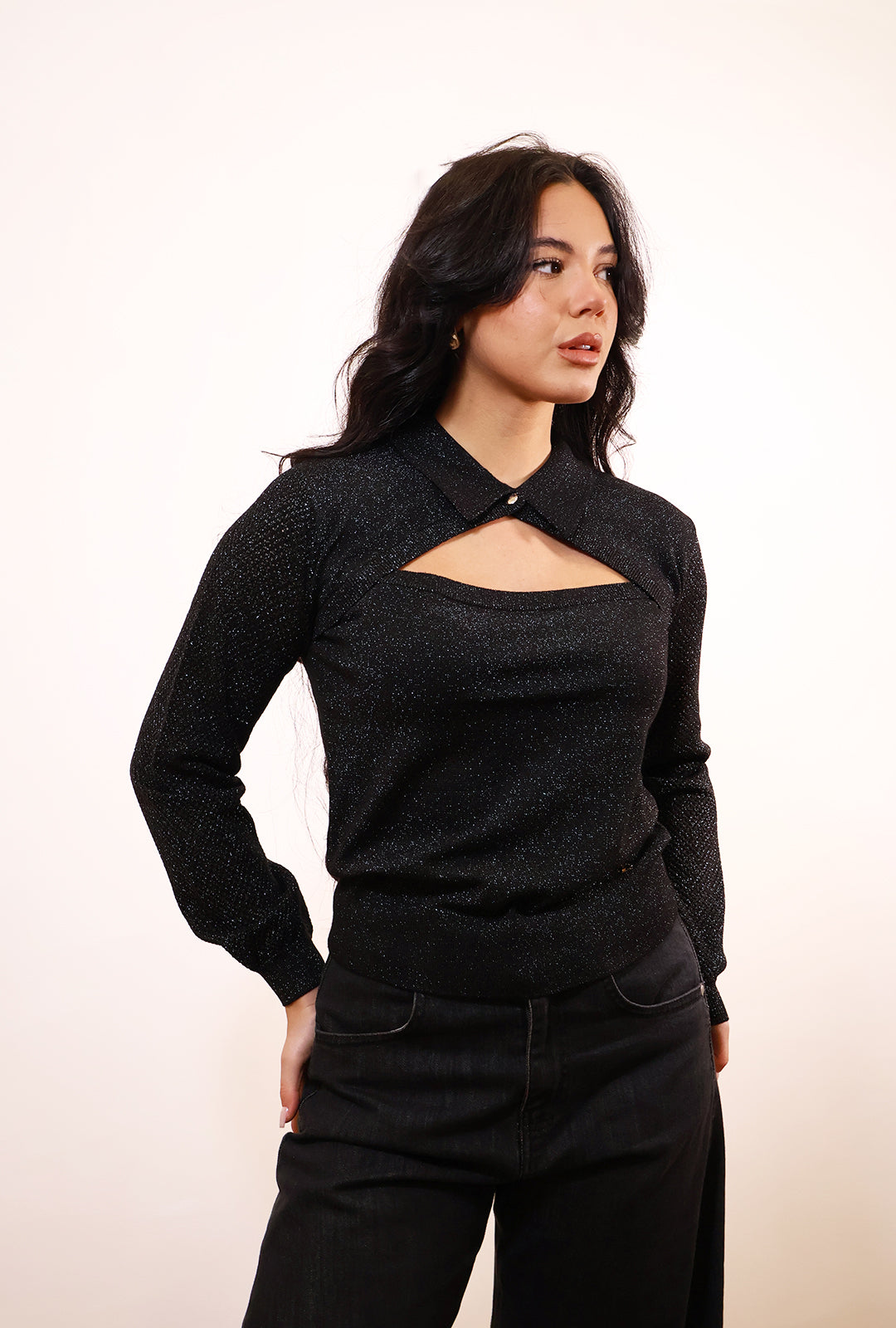 Maglia Gaudi’ in black lurex con colletto e scollatura profonda,la manica è leggermente traforata per dare un tocco dí glamour.Abbinala con i jeans Ballon black Over/D e le mitiche dottor Martens