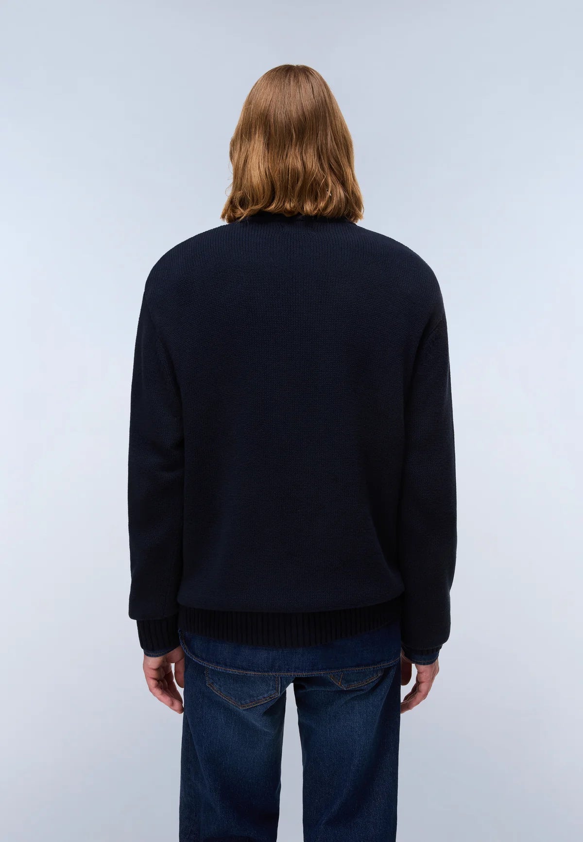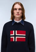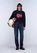 Il maglione Mura è un capo caldo e confortevole, ispirato all’estetica alpina. Realizzato in 100% cotone, è caratterizzato da una bandiera norvegese lavorata a intarsio. Completano il design il girocollo classico e le finiture a costine su polsi, collo e orlo.