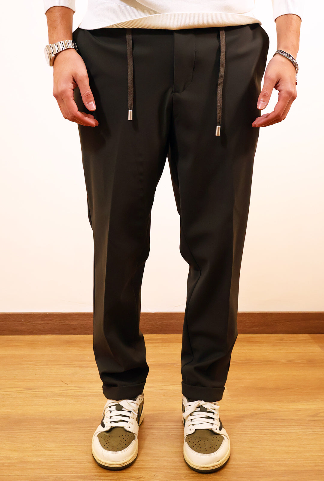Pantalone dalla linea slim ,oltre al bottone e zip porta anche un laccio in vita per rendere più sportivo il tuo outfit. Tessuto tecnico super comodo in quanto un po’ stretch.Abbinalo con il pullover collo alto di RAPU .