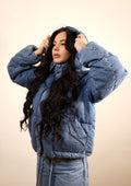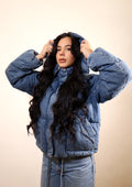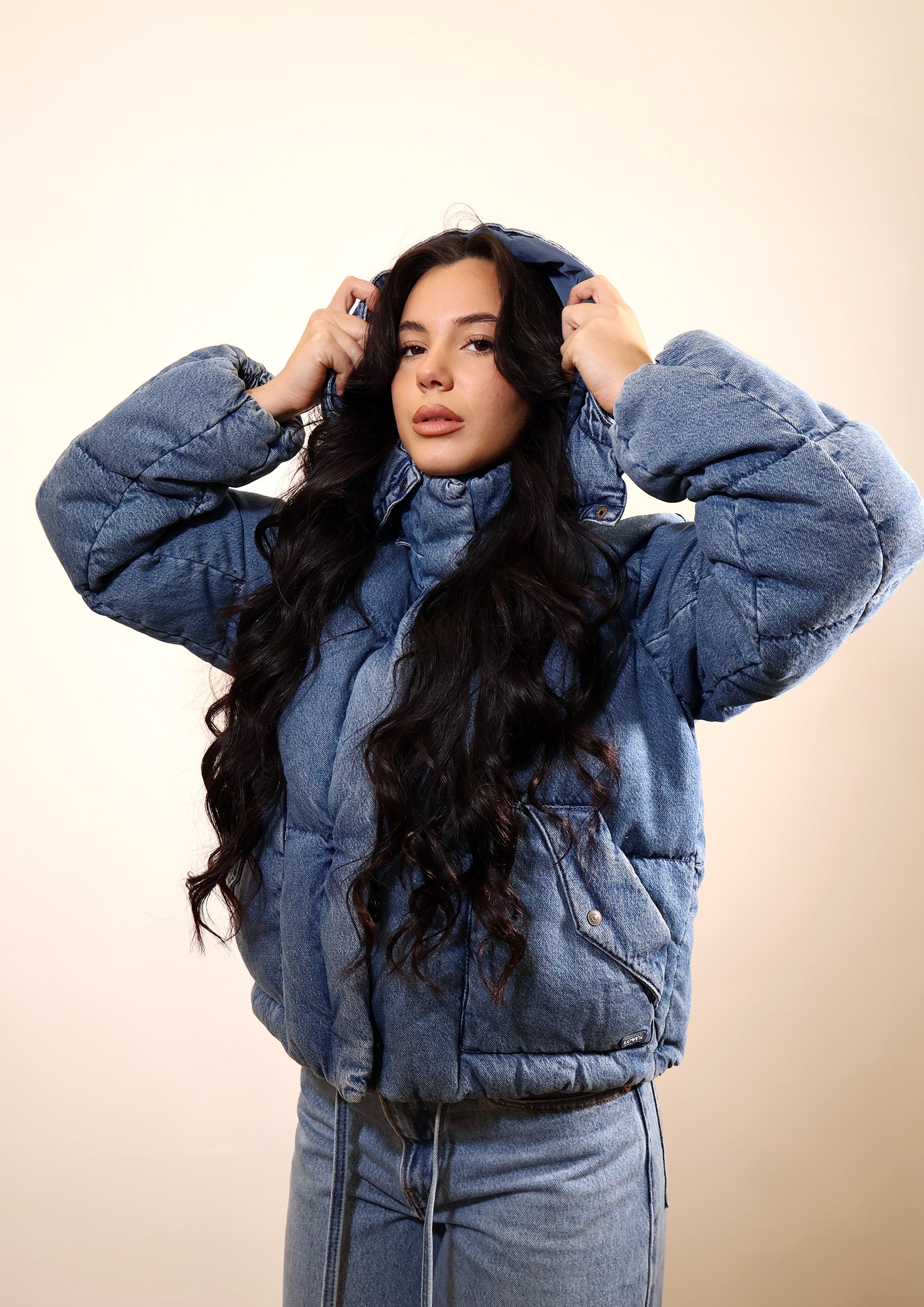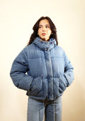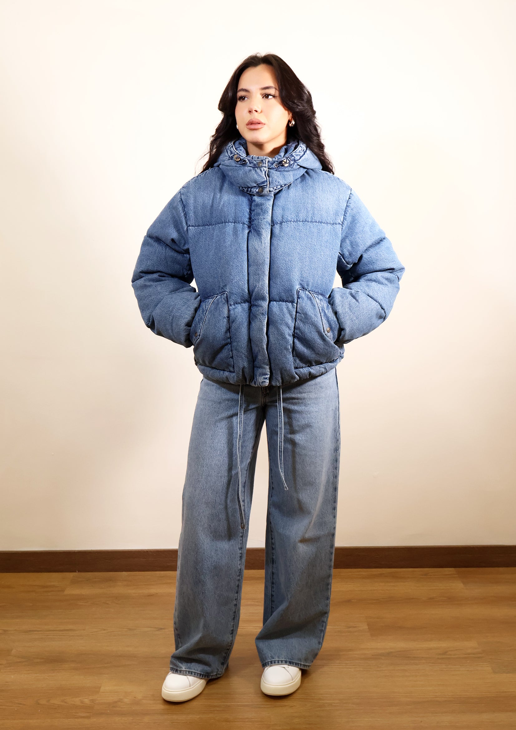 Piumino Levis imbottito con 600 Fili di piuma d’oca , questo capo è una rivisitazione di un capo preso dagli archivi degli anni 80’ . L’esterno in DENIM rende il capo Vintage.Cappuccio staccabile,chiusura con zip e bottoni.