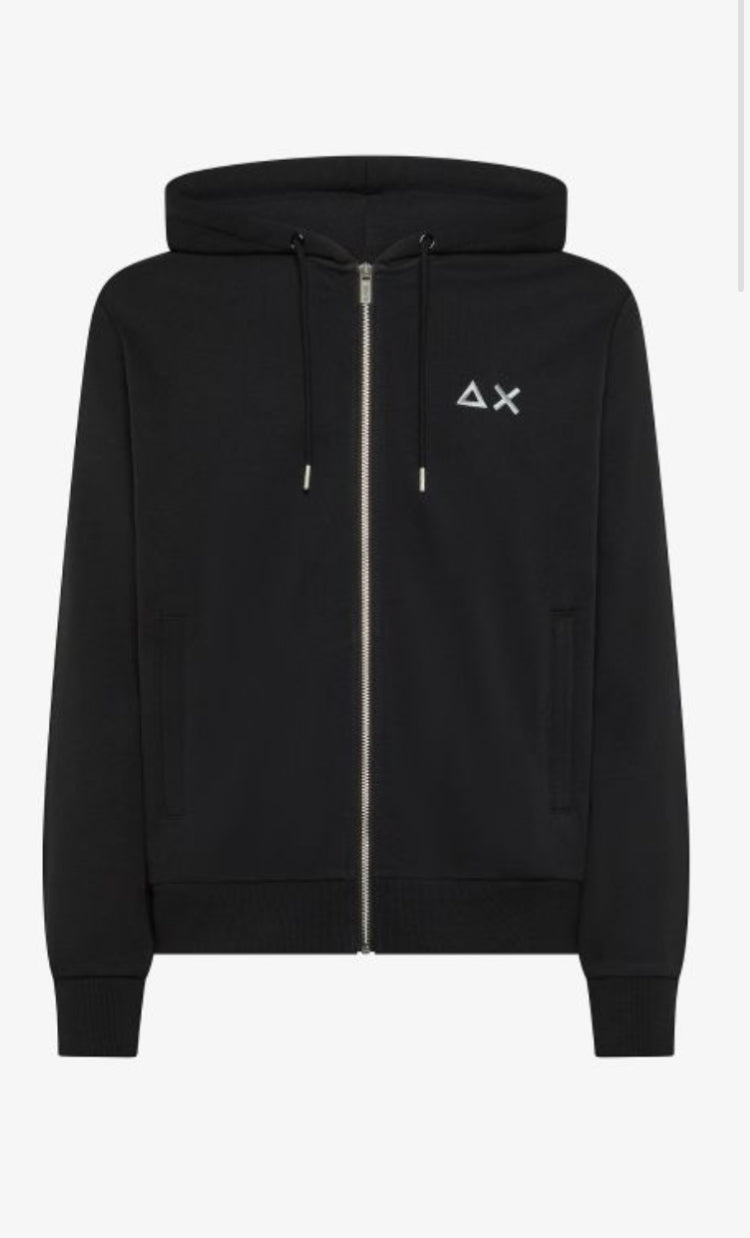 Realizzata in french terry un tessuto che permette di indossare il capo tutto l’anno.Full zip e cappuccio,tasche con chiusura a zip.